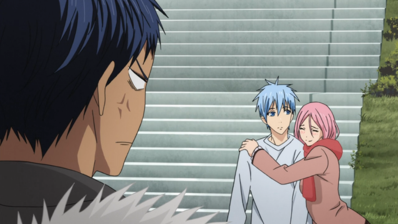 Kuroko and Momoi are seen talking on a nearby bench and Momoi congratulates him on entering the final league of the preliminaries. She then talks about Kagami, comparing him to Aomine. She recalls Aomine's playing style from the past and says that if only he would lose once, that he would return, but he simply doesn't lose. Kuroko speculates that he might win against Aomine and when Momoi takes her leave, he promises her that he'll win for Aomine's sake.[8] She later encounters Aomine and scolds him for skipping practice. She was shocked to learn that he had met Kagami and that he thought that Kagami and Kuroko were a bad match.